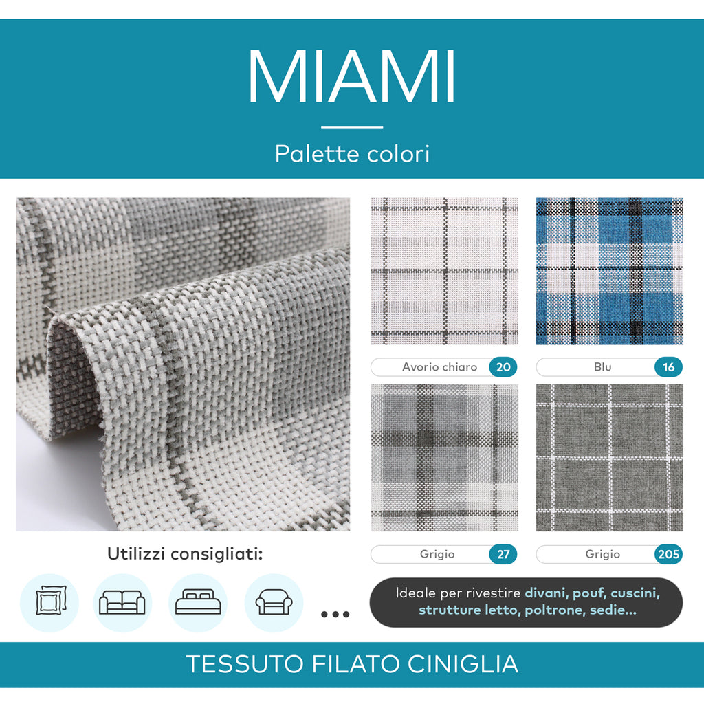 Miami è il nuovo tessuto al metro dal design geometrico, simile al tartan scozzese, facile da tagliare e cucire, perfetto per aggiungere un tocco unico e raffinato alle tue creazioni. Il design finestrato a quadri grandi si integra con semplicità a diversi stili e ambienti, dal classico al moderno
