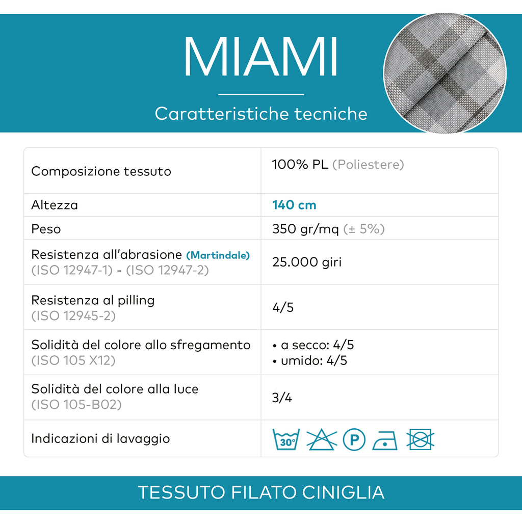 • Caratteristiche tecniche: Non si stropiccia, mantiene la piega e tende a riacquisirla anche dopo i lavaggi (permettendo di evitare la stiratura) inattaccabile da muffe e batteri; Miami è composta al 100% da fibre di poliestere che assicurano una lunga durabilità e un'elevata resistenza alle sollecitazioni