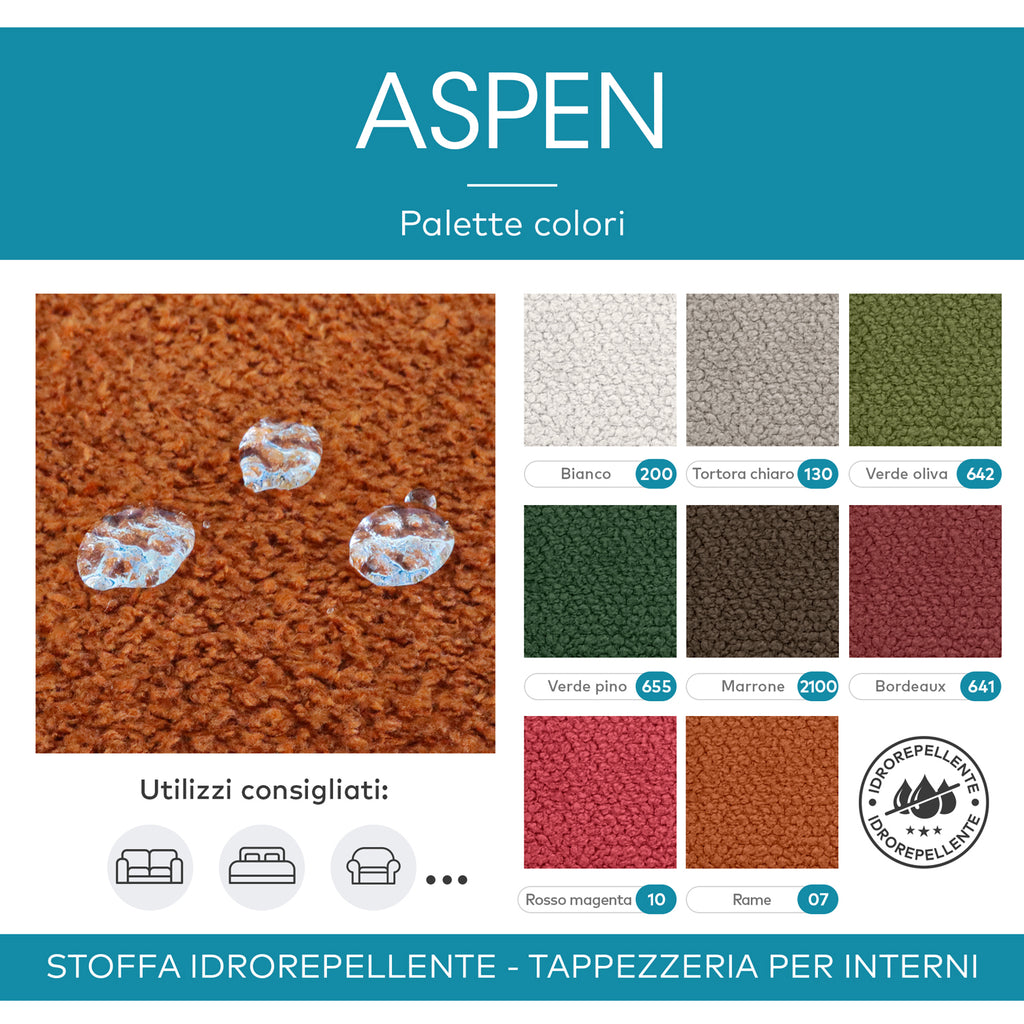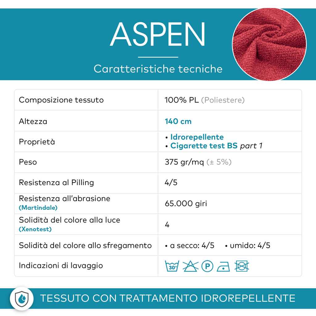 - Resistente: Grazie al peso di 375 gr/m² e all’ottima resistenza all’abrasione (65.000 giri Martindale), ASPEN è un tessuto per tappezzeria pensato per durare nel tempo. Si presta a un utilizzo frequente su mobili da soggiorno, sedie da cucina, imbottiti e arredi da interni, mantenendo la propria qualità anche dopo anni di utilizzo.