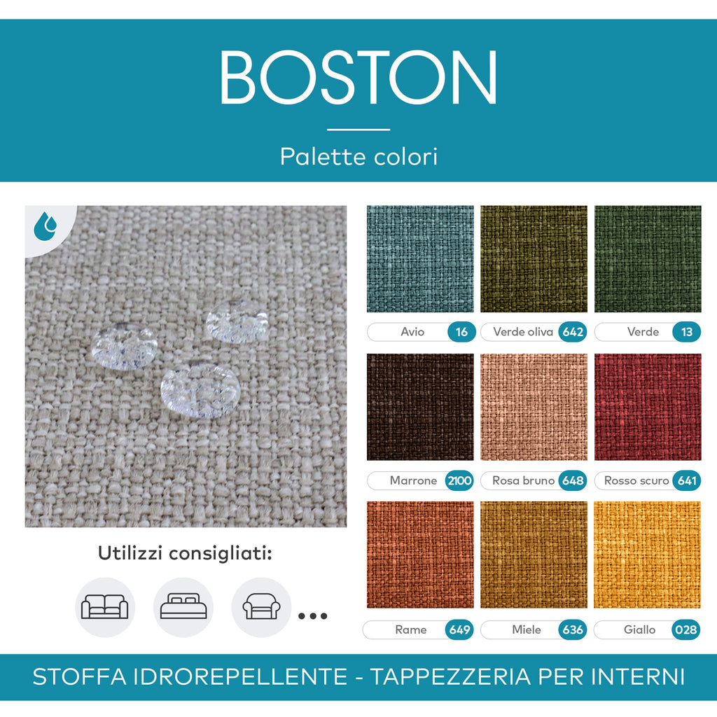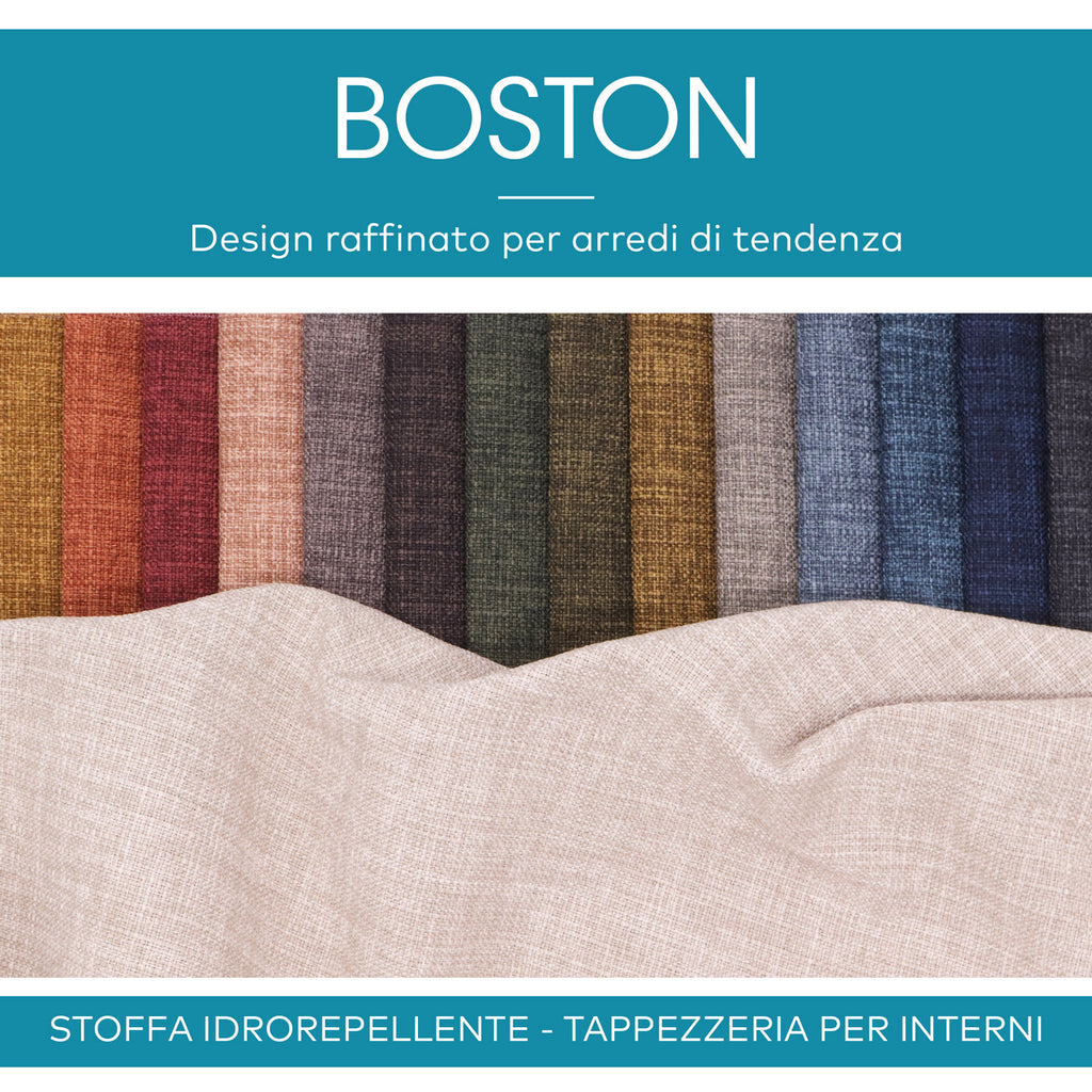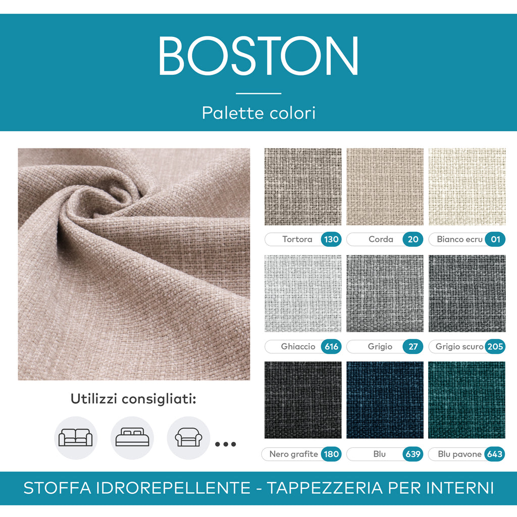 - Varianti: Boston è disponibile in un'ampia palette di colori per abbinarsi con facilità a diversi stili dalle tonalità più scure come il grigio, il blu notte, il verde a quelle più luminose come il bianco ecru, il giallo, il grigio ghiaccio per uno stile più moderno e minimale. Boston si adatterà perfettamente a qualsiasi ambiente della tua casa: soggiorno, camera da letto, cucina, etc.