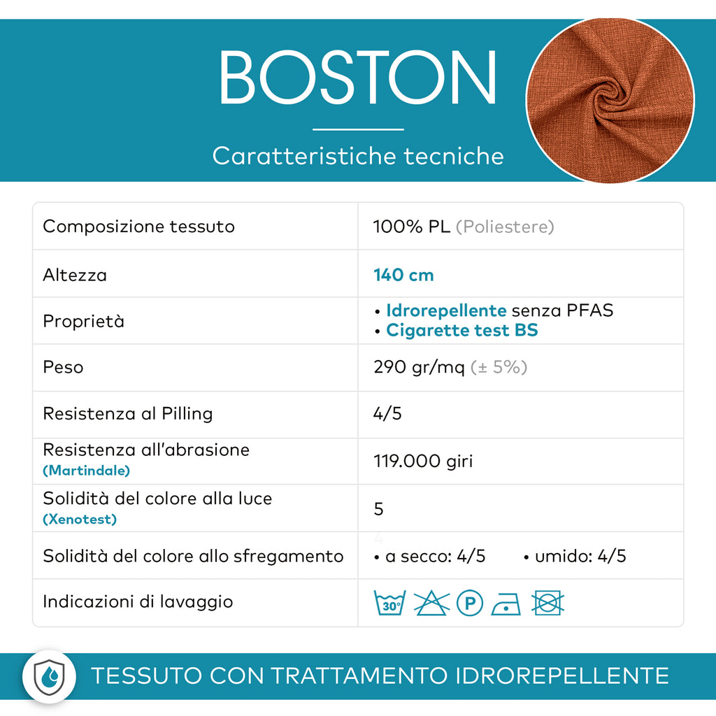 - Applicazioni: Boston è la stoffa al metro ideale per l'arredamento e il fai-da-te: può essere impiegata per rivestire mobili imbottiti come divani moderni o classici, testate dei letti, poltrone, sedie, pouf, cuscini e complementi d'arredo in genere o per realizzare progetti artigianali come borse, astucci, pochette, etc.