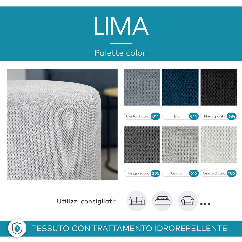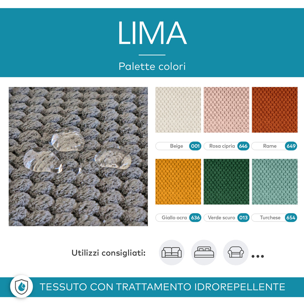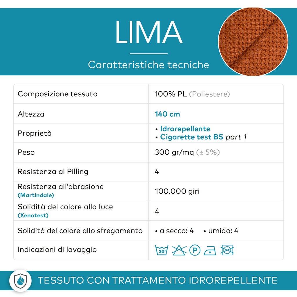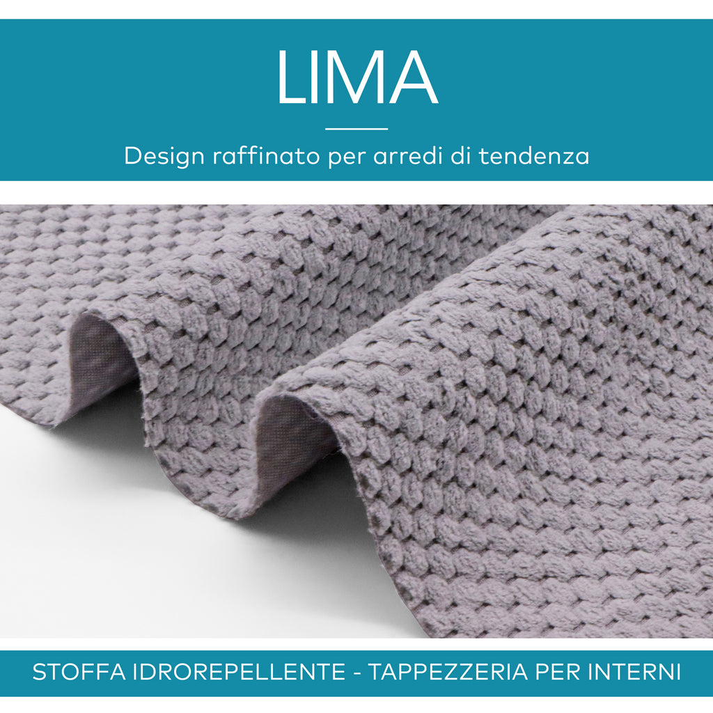- Vantaggi: LIMA è un tessuto pratico e affidabile, progettato per durare nel tempo. Grazie al trattamento idrorepellente, respinge i liquidi ed evita l’assorbimento immediato, facilitando la pulizia quotidiana. La sua struttura resistente sopporta fino a 100.000 cicli Martindale e resiste efficacemente al pilling (grado 4), rendendolo ideale per divani e sedute usati ogni giorno, anche in case con bambini o animali.
