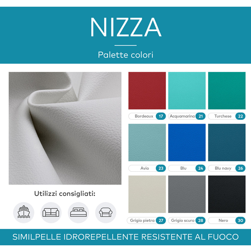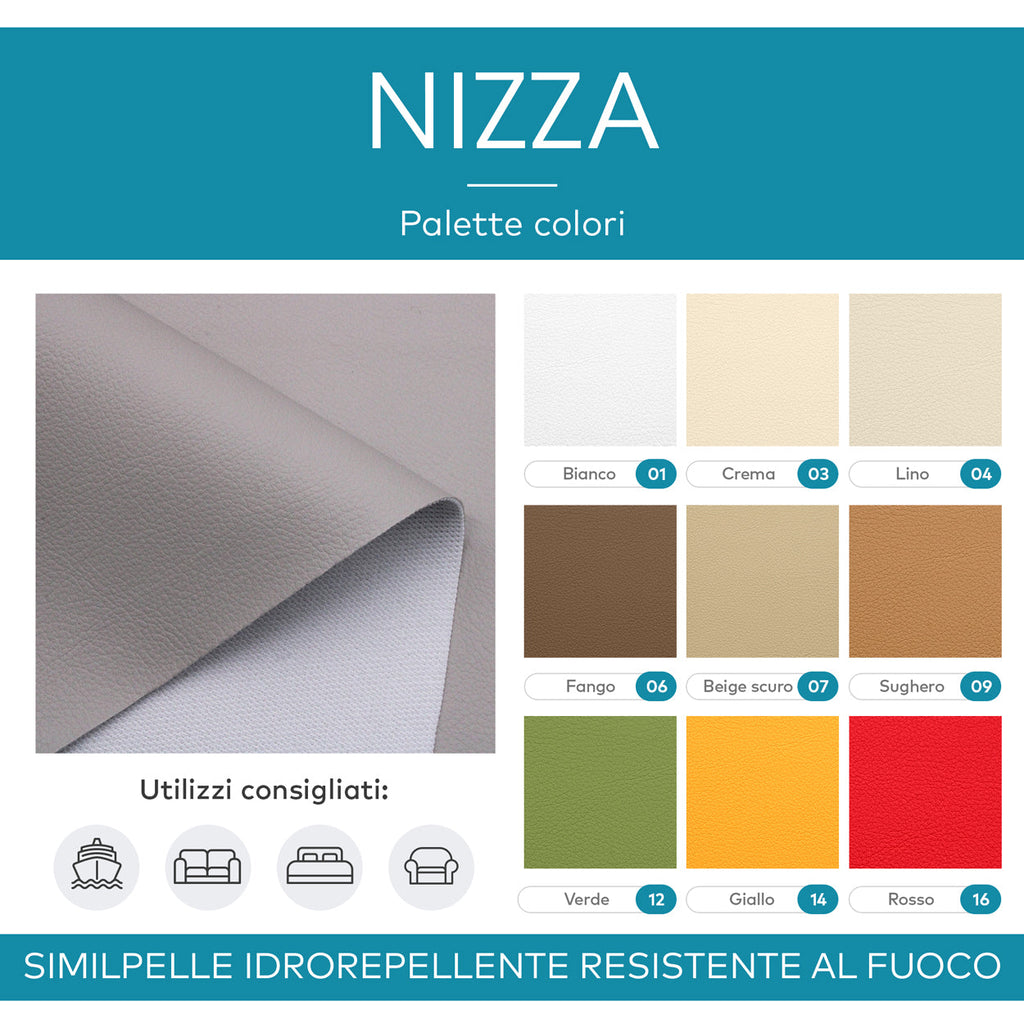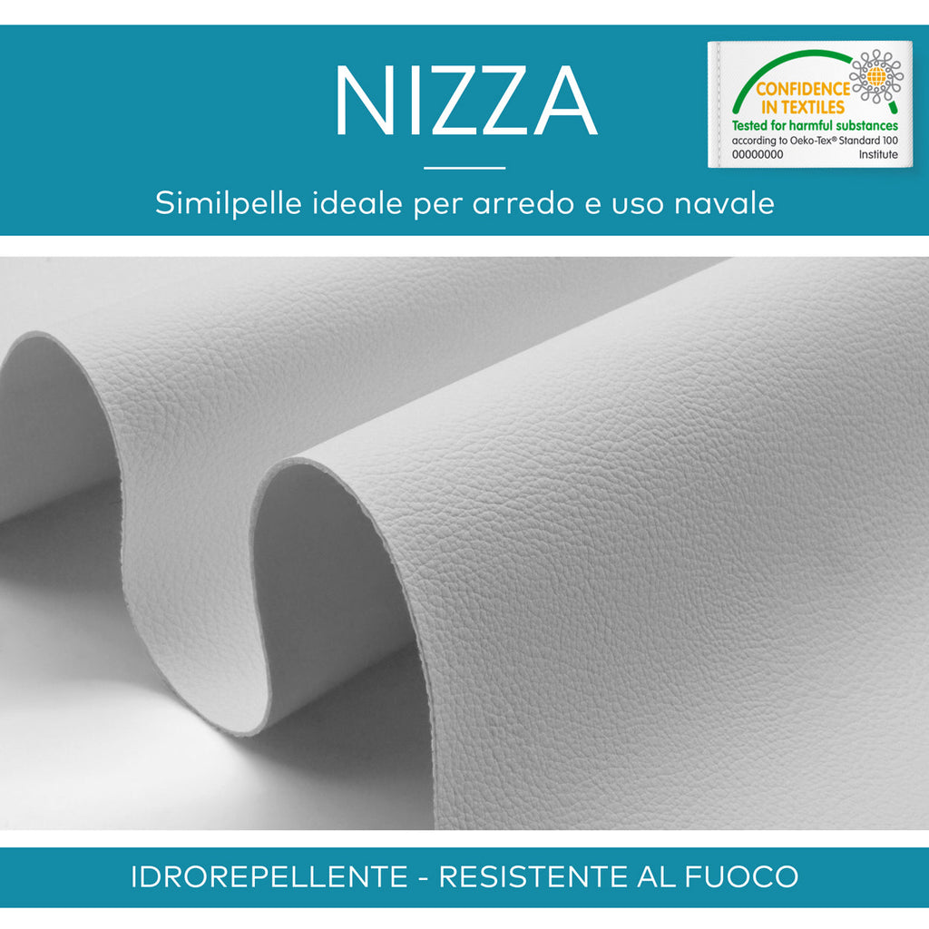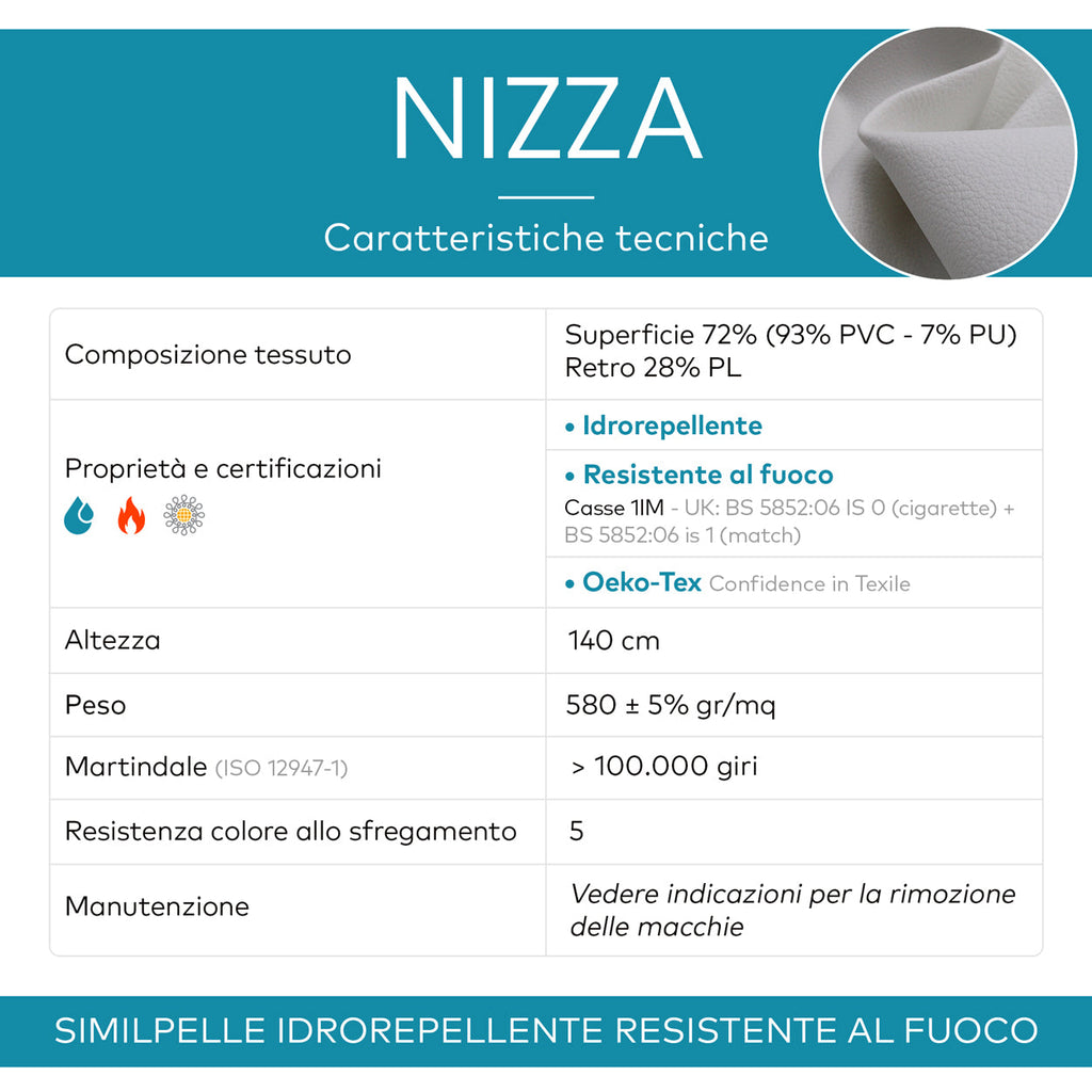 - Caratteristiche tecniche: Nizza è resistente al fuoco, idrorepellente (resistente pertanto a macchie ed umidità) e certificata Oeko-Tex che garantisce il controllo della stoffa e l'assenza di sostanze chimiche e coloranti nocive per la salute. L'ecopelle Nizza è disponibile in tanti colori dalle tonalità più scure come il nero, grigio, il blu, il verde a quelle più luminose come il bianco, il crema o il giallo per uno stile più moderno e minimale.
