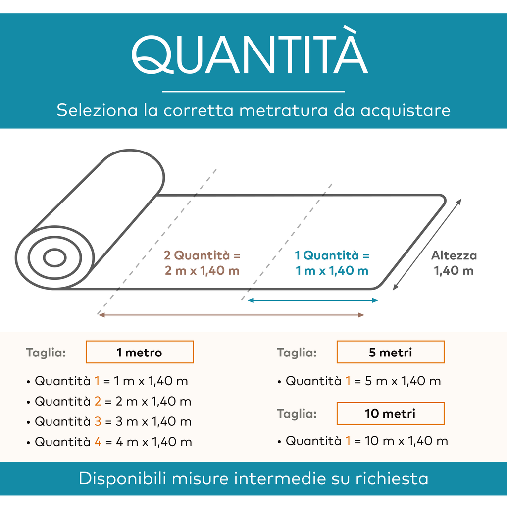 Modalità di acquisto: Ordinando più quantità dello stesso colore, riceverai un unico pezzo di stoffa della metratura richiesta. Esempio: 1 quantità = 1 m x 1,40 m ; 2 quantità = 2 m x 1,40 m ; 3 quantità = 3 m x 1,40 m ; etc - Inserendo le quantità da 5 metri e 10 metri potrai risparmiare sui tagli più grandi!