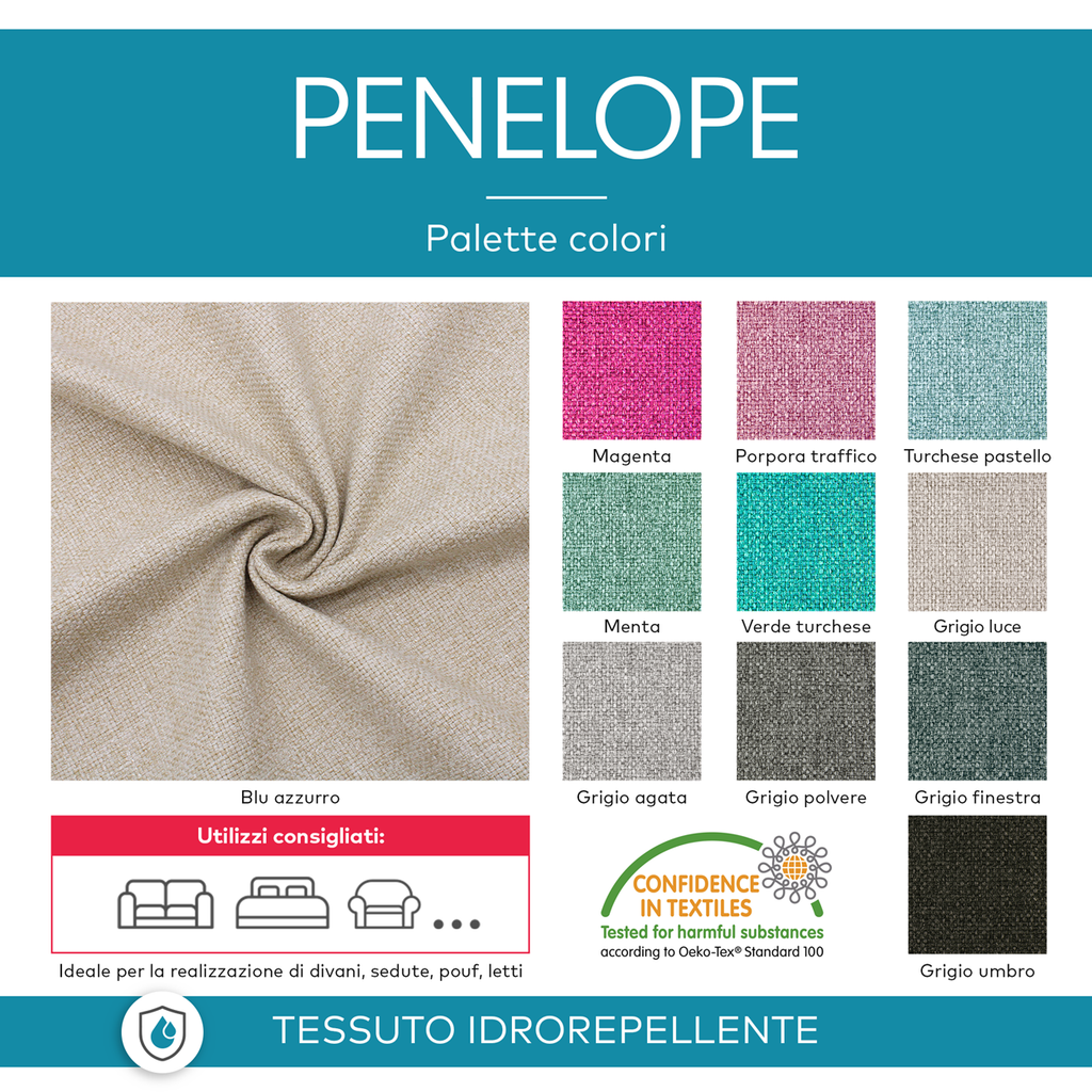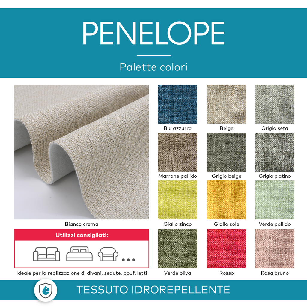 • L'ottimo rapporto qualità prezzo, l'elevata durabilità, la resistenza all'usura e la semplicità nella pulizia fanno di Penelope un tessuto estremamente versatile e apprezzato da chi ha bambini in famiglia