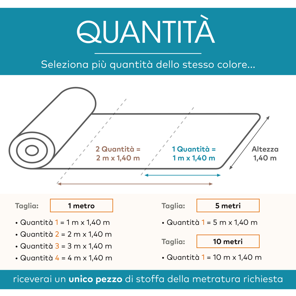 Modalità di acquisto: Ordinando più quantità dello stesso colore, riceverai un unico pezzo di stoffa della metratura richiesta. Esempio: 1 quantità = 1 m x 1,40 m ; 2 quantità = 2 m x 1,40 m ; 3 quantità = 3 m x 1,40 m ; etc - Inserendo le quantità da 5 metri e 10 metri potrai risparmiare sui tagli più grandi!