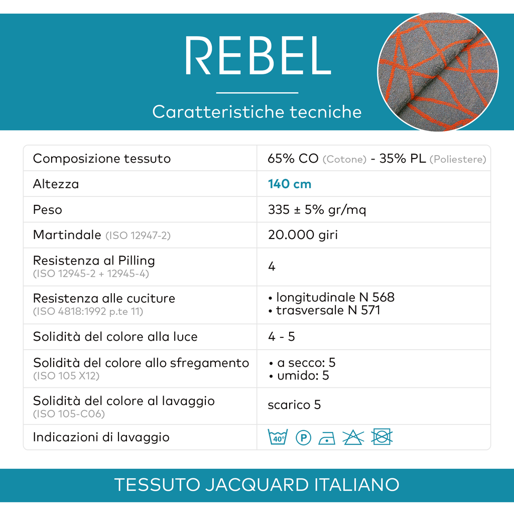 - Rebel mantiene la piega e tende a riacquisirla anche dopo i lavaggi, è lavabile a 40° e si può stirare a bassa temperatura (non asciugare in asciugatrice).