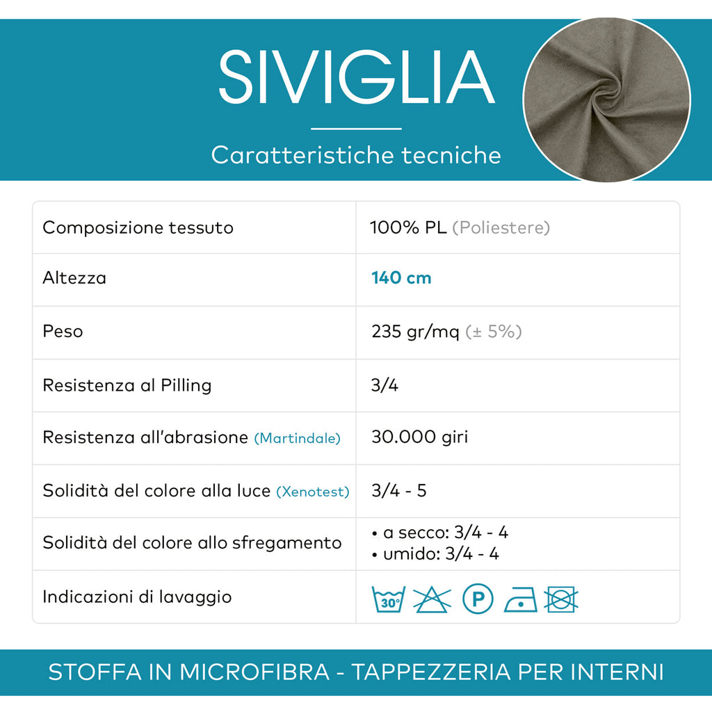 • Manutenzione: La stoffa può essere lavata in lavatrice a 30° e stirata a bassa temperatura, non asciugare in asciugatrice, non candeggiare. Siviglia garantisce un'ottima resistenza alle sollecitazioni e all'usura e quindi una lunga durata nel tempo (Martinale 30.000 giri).